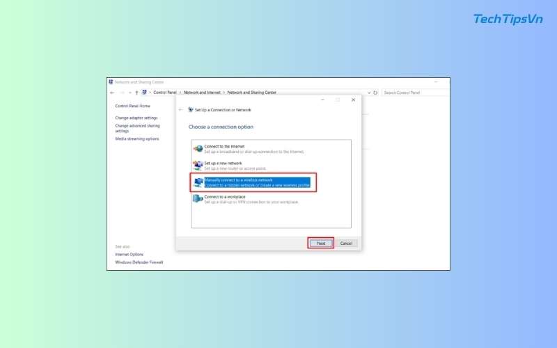 Bước 5: Tiếp tục chọn Manually connect to a wireless network và nhấn Next để nhập thông tin mạng WiFi.