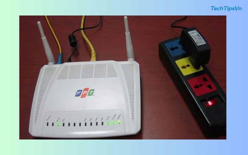 Trước tiên, cắm nguồn cho modem FPT và đảm bảo dây mạng từ cổng WAN được kết nối đúng. Chờ vài phút để modem khởi động hoàn toàn (thường đèn tín hiệu sẽ sáng ổn định).