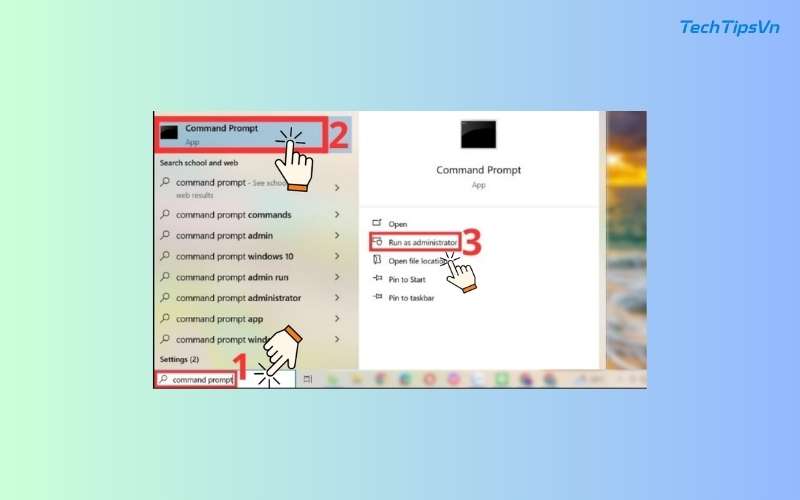 Bước 1: Truy cập Start Menu và nhập “Command Prompt” vào thanh tìm kiếm trên màn hình. Khi kết quả xuất hiện, nhấp chuột phải vào ứng dụng và chọn “Run as administrator”. Thao tác này giúp mở Command Prompt với quyền quản trị, đảm bảo bạn có thể thực hiện các lệnh cần thiết.