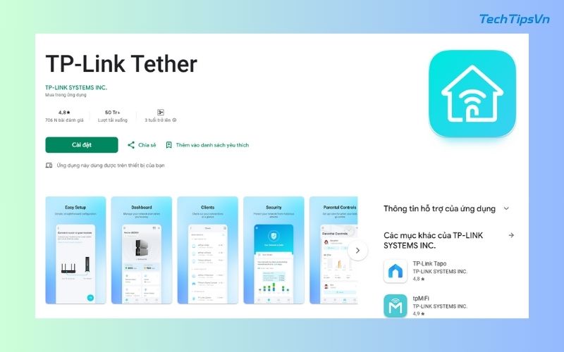 Để cài đặt wifi TP Link WR841N bằng điện thoại, bạn cần tải ứng dụng TP Link Tether. Đây là công cụ chính thức từ TP Link giúp quản lý và cấu hình router dễ dàng: