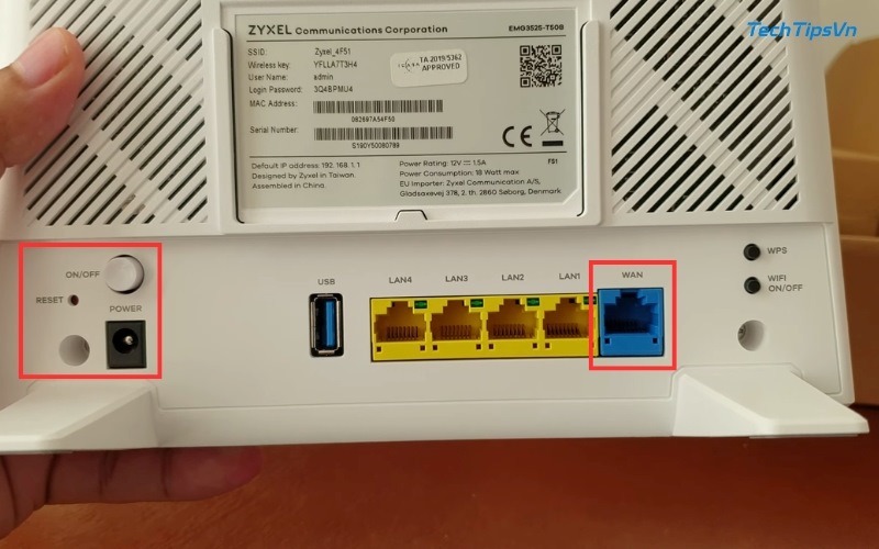 Trước tiên, bạn hãy kết nối nguồn điện cho router Zyxel và bật thiết bị bằng cách nhấn nút ON/OFF. Nếu cần khôi phục cài đặt mặc định, chỉ cần dùng vật nhọn như cây tăm để nhấn và giữ nút Reset ở phía sau router trong vài giây. Sau đó, cắm dây mạng từ modem vào cổng WAN của router.